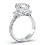 This round side stone tapered pavé engagement ring amplifies the center stone while minimizing the appearance of the metal. This engagement ring can be special ordered in any finger size, in Platinum, 18KT & 14KT gold and can be customized for any shape and size center stone.