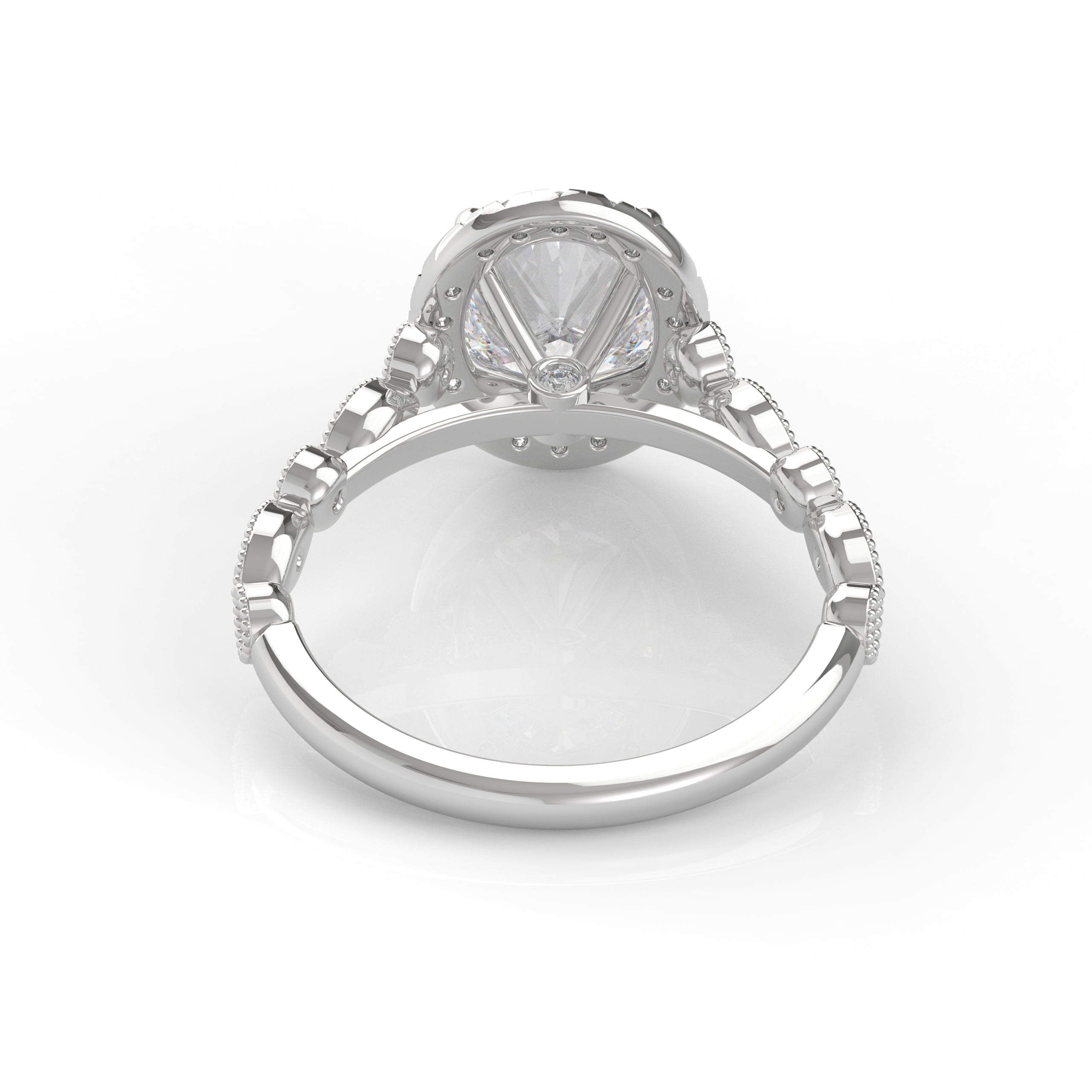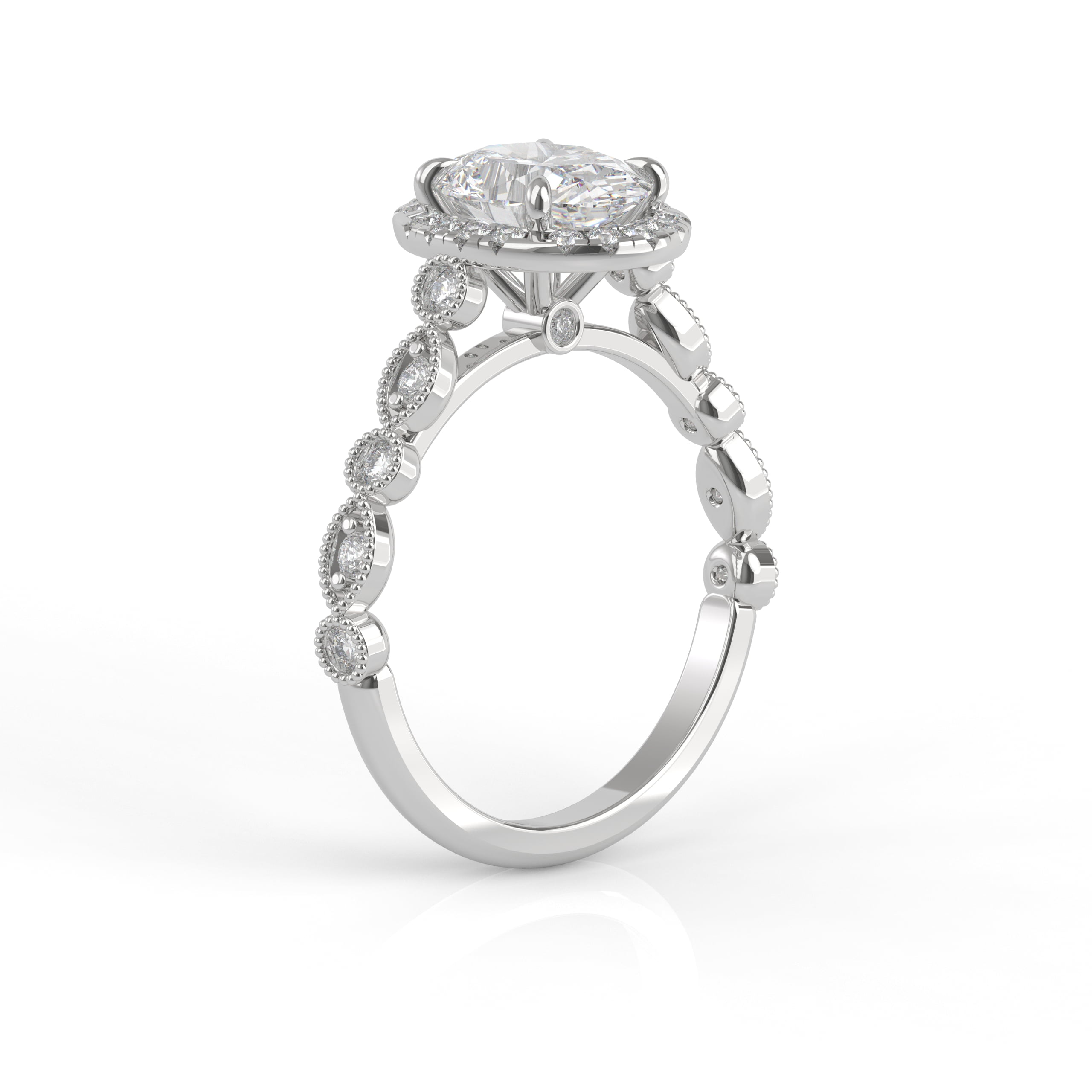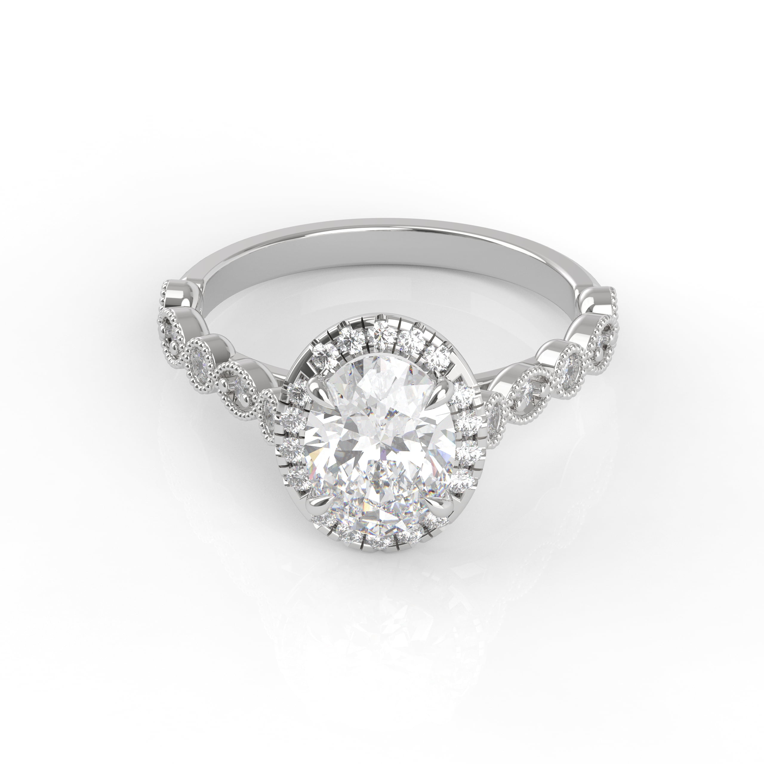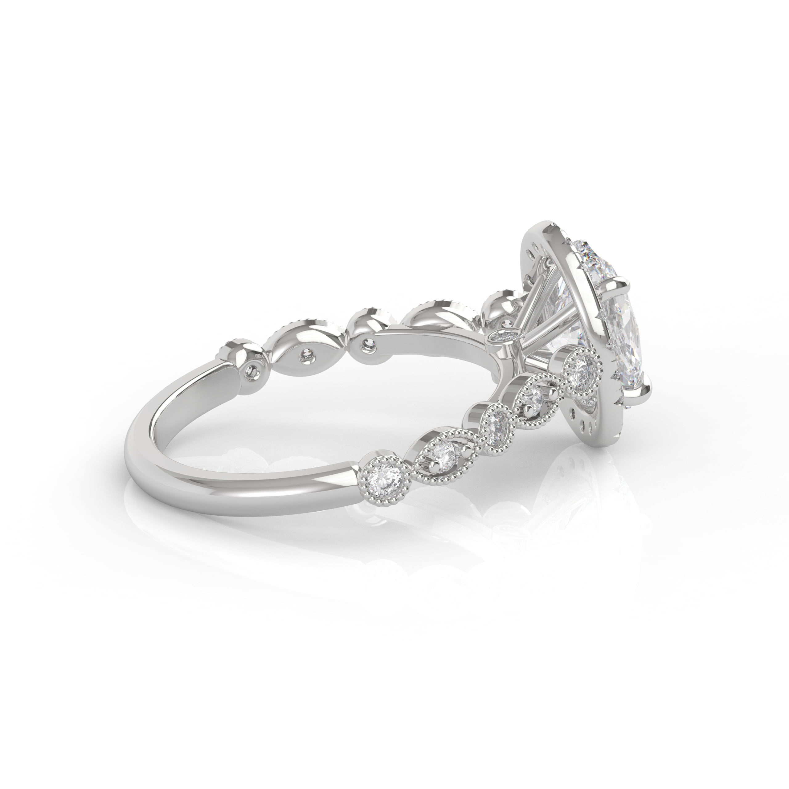 This timeless design has both classic appeal and a contemporary look with an extra touch of detailing and a glimmering band. This detailed engagement ring can be special ordered in any finger size, in Platinum, 18KT & 14KT gold and can be customized for any shape and size Centerstone.