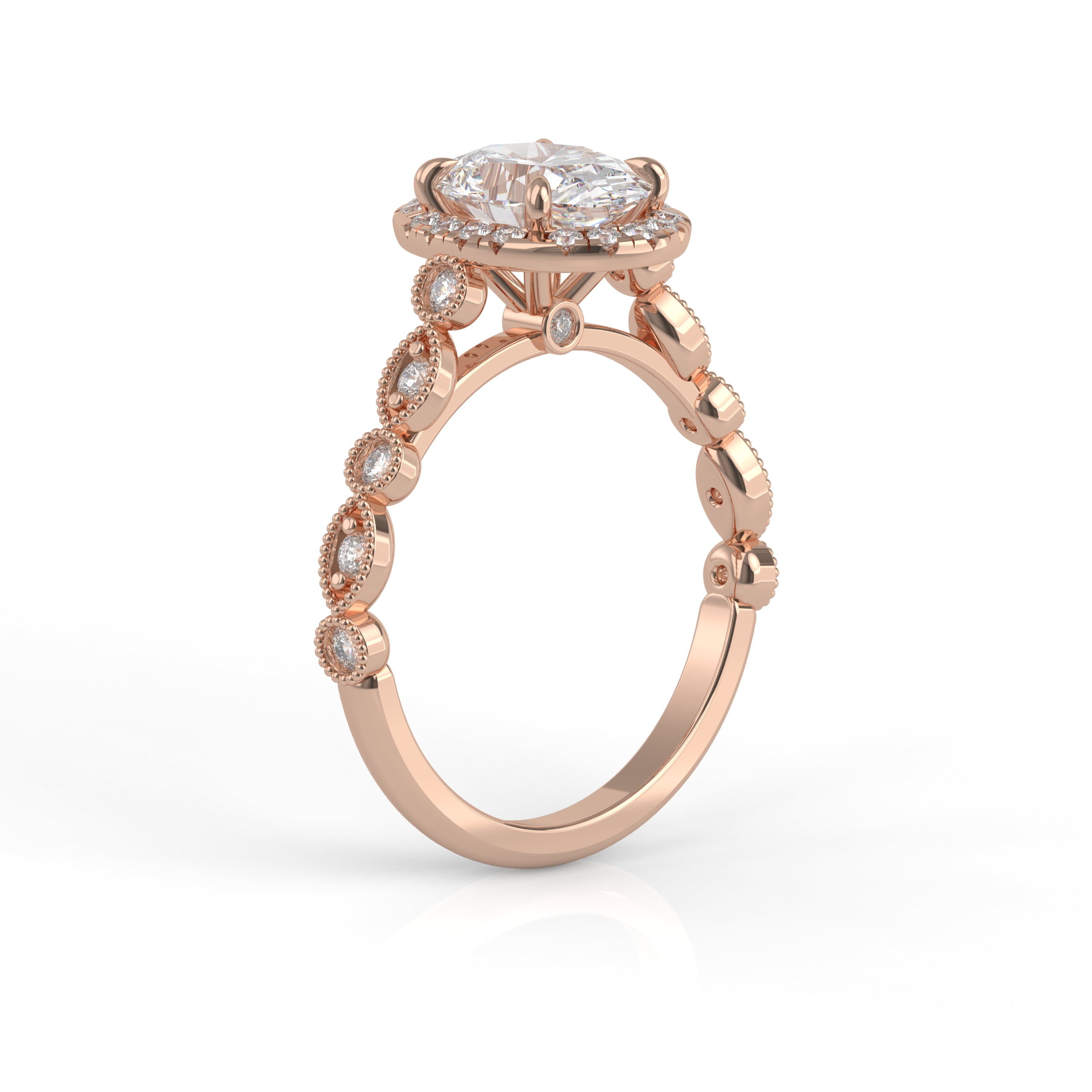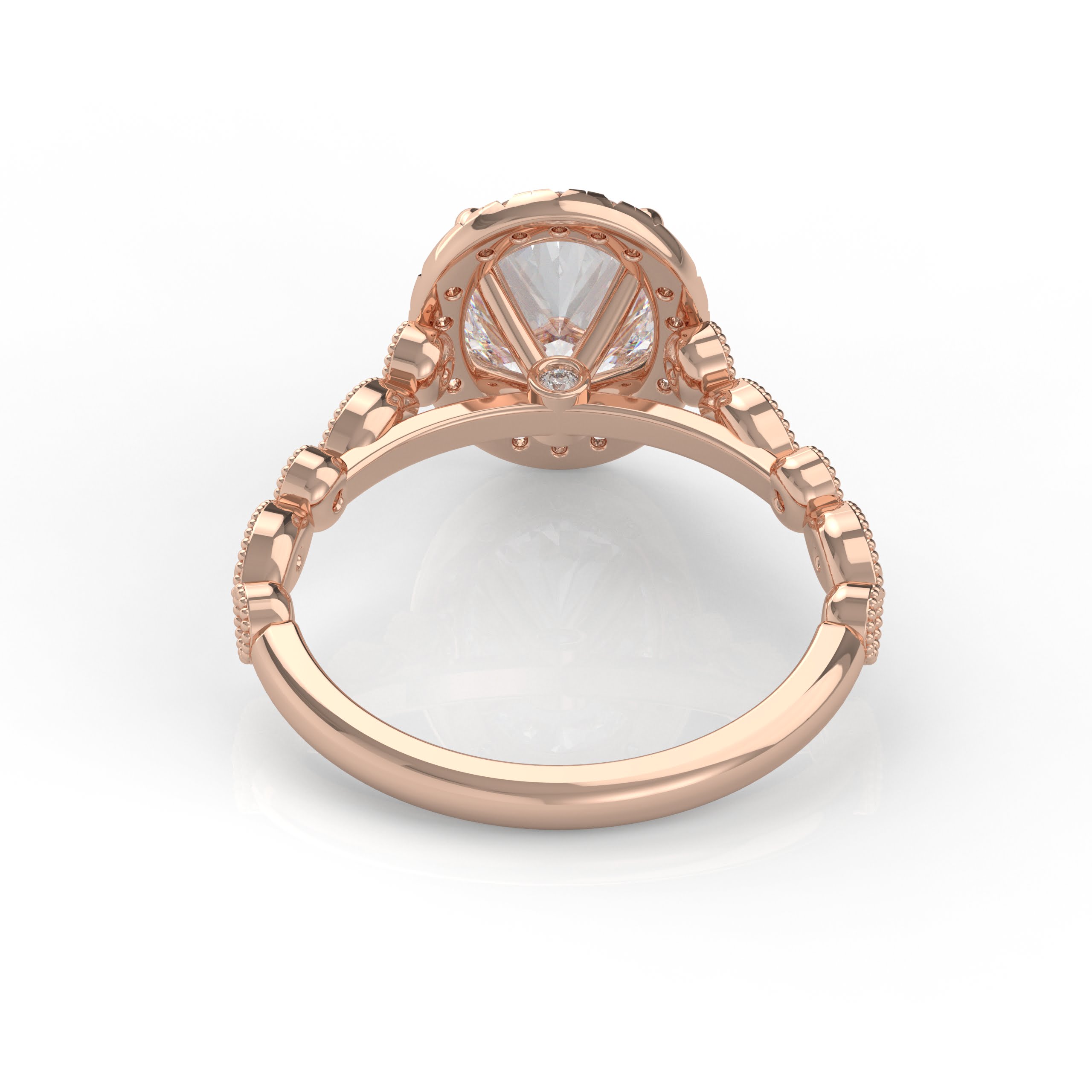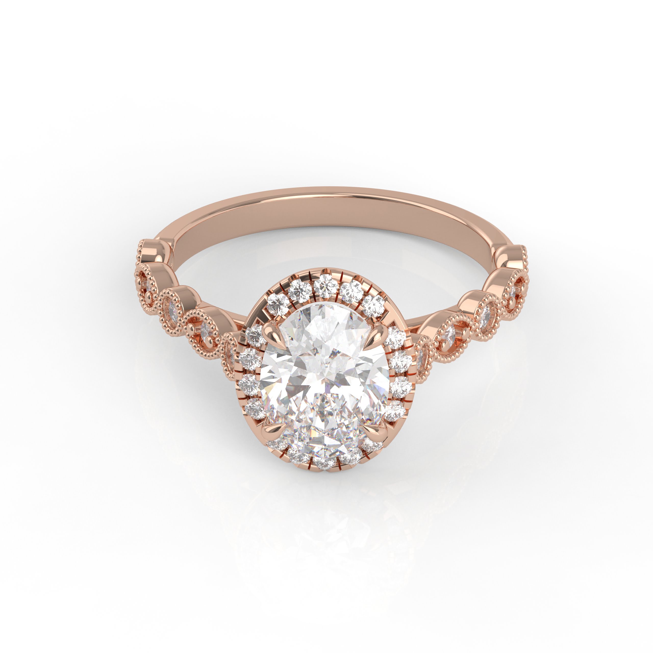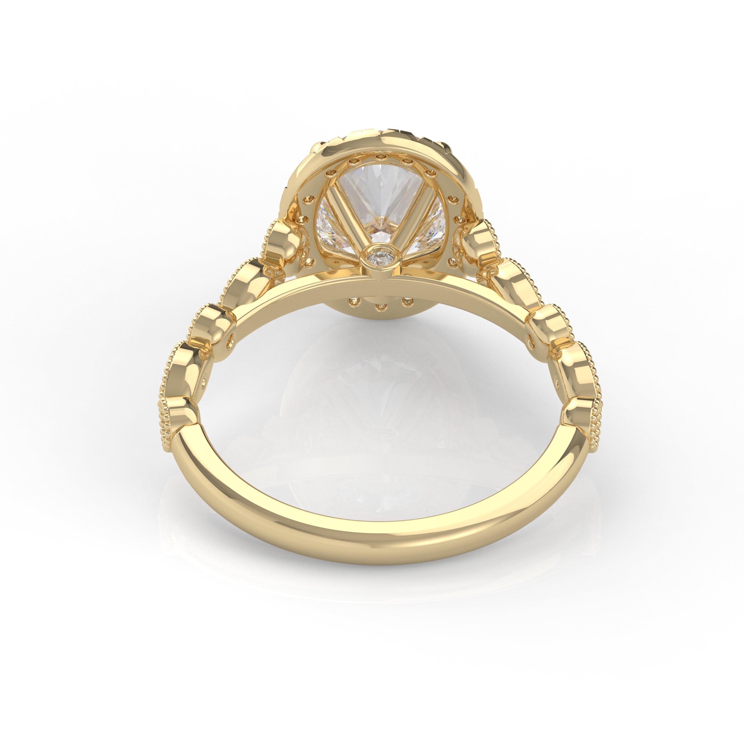This timeless design has both classic appeal and a contemporary look with an extra touch of detailing and a glimmering band. This detailed engagement ring can be special ordered in any finger size, in Platinum, 18KT & 14KT gold and can be customized for any shape and size Centerstone.