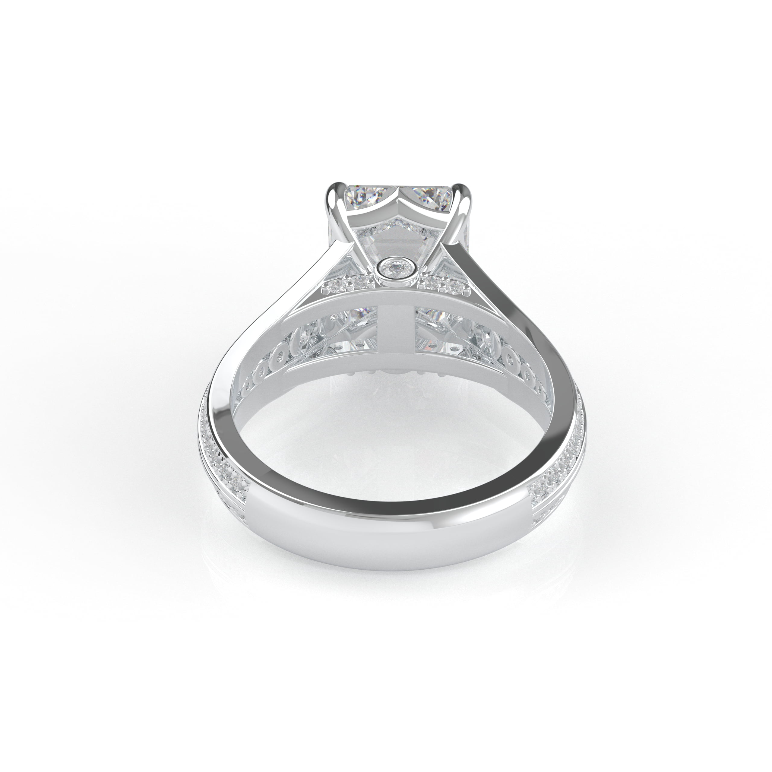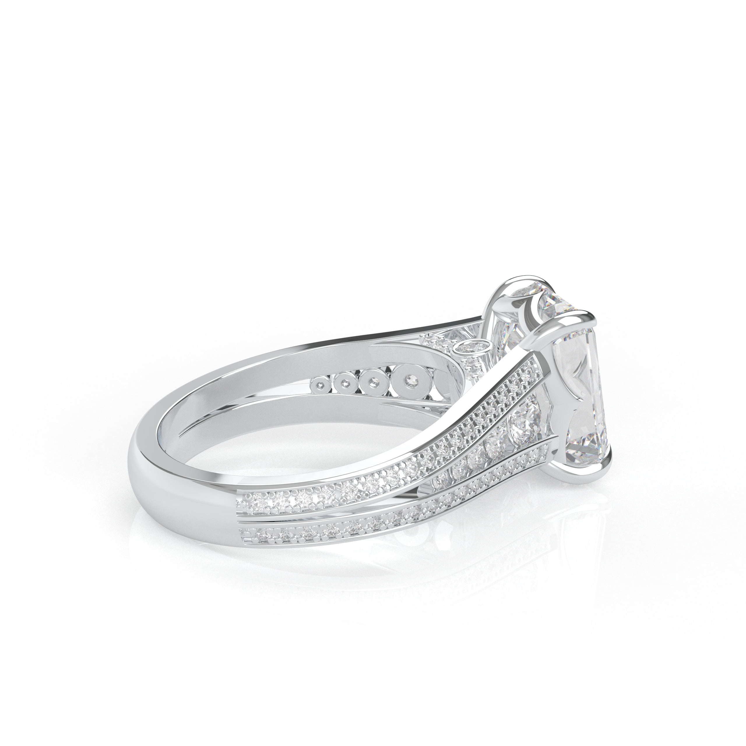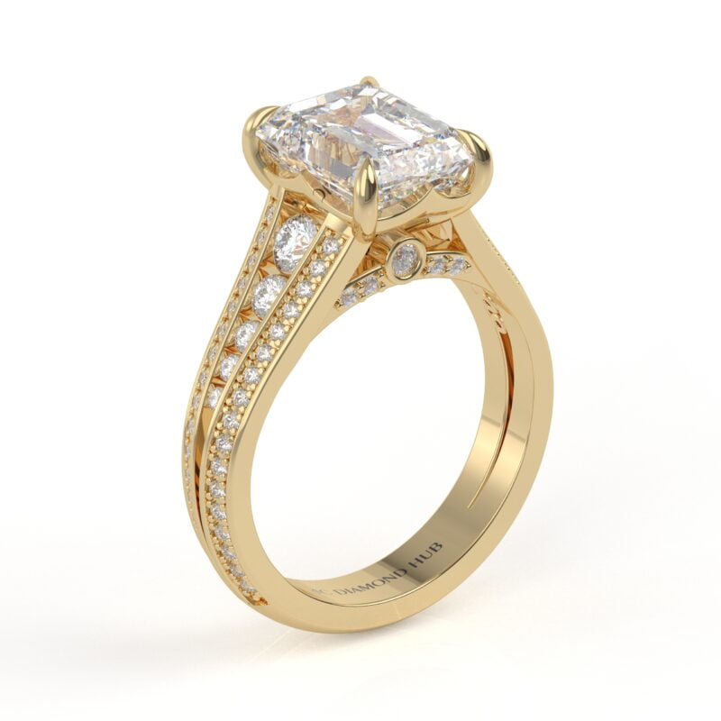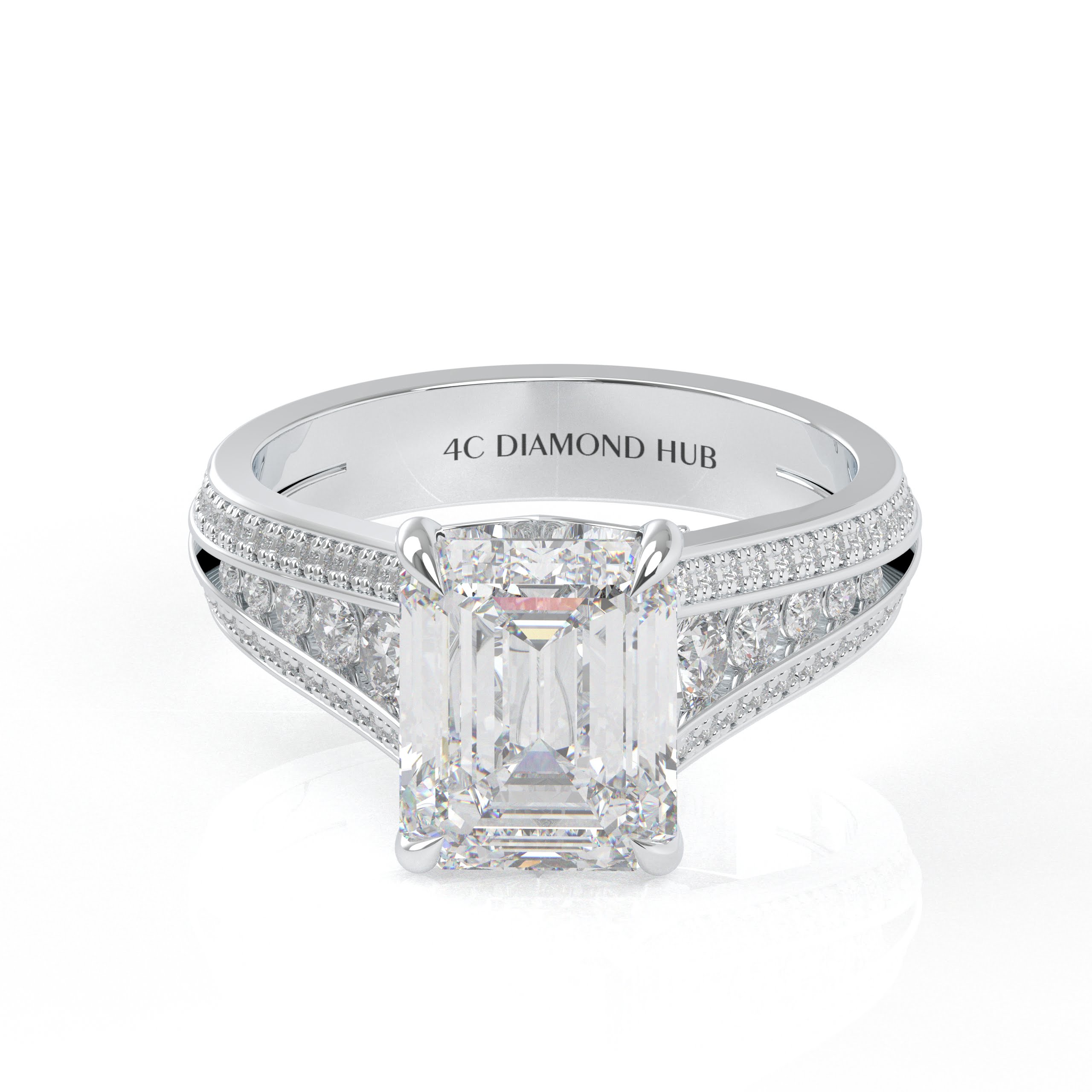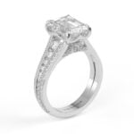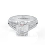 14K White Gold Emerald Cut Diamond Solitaire Engagement Ring with Triple-Row Diamond Band