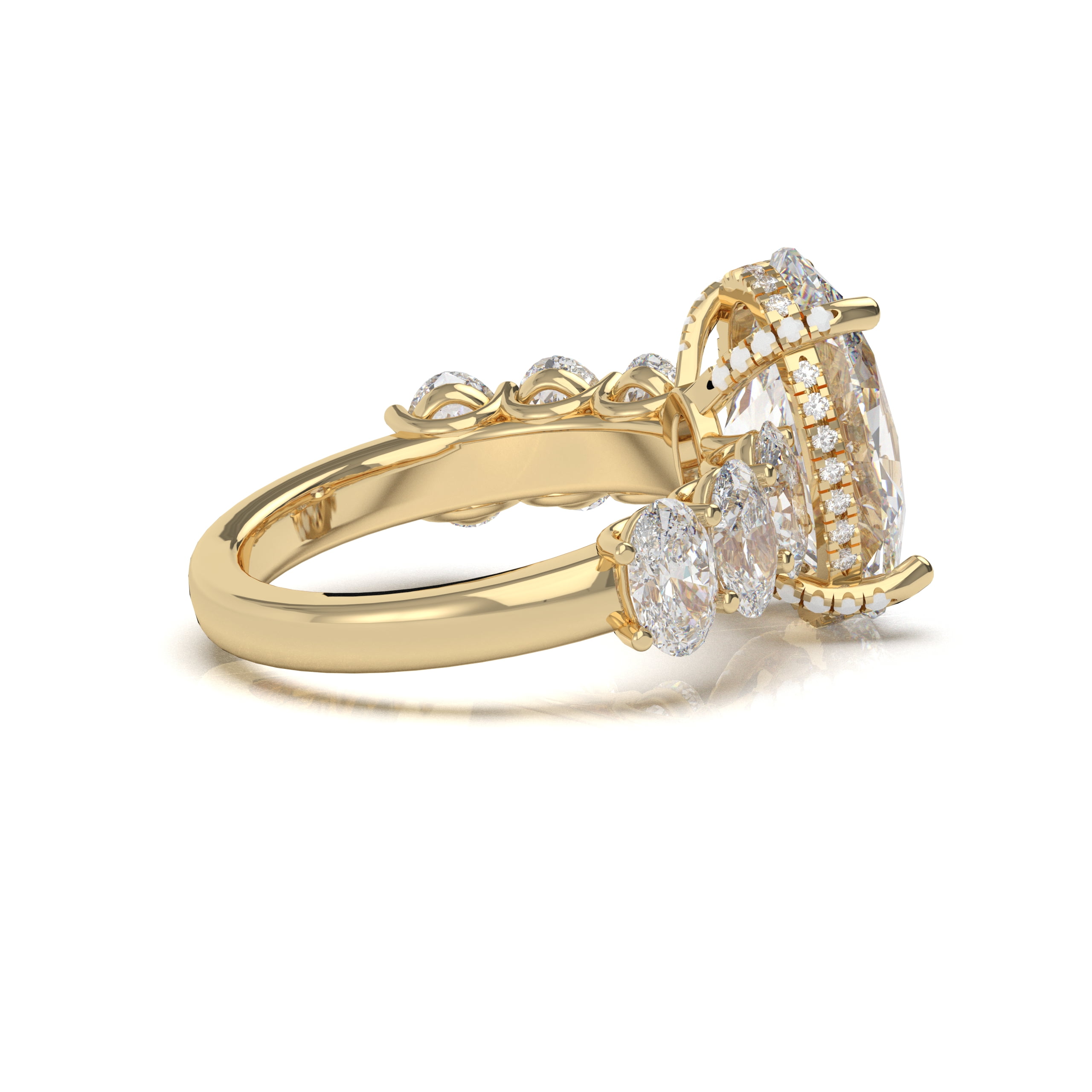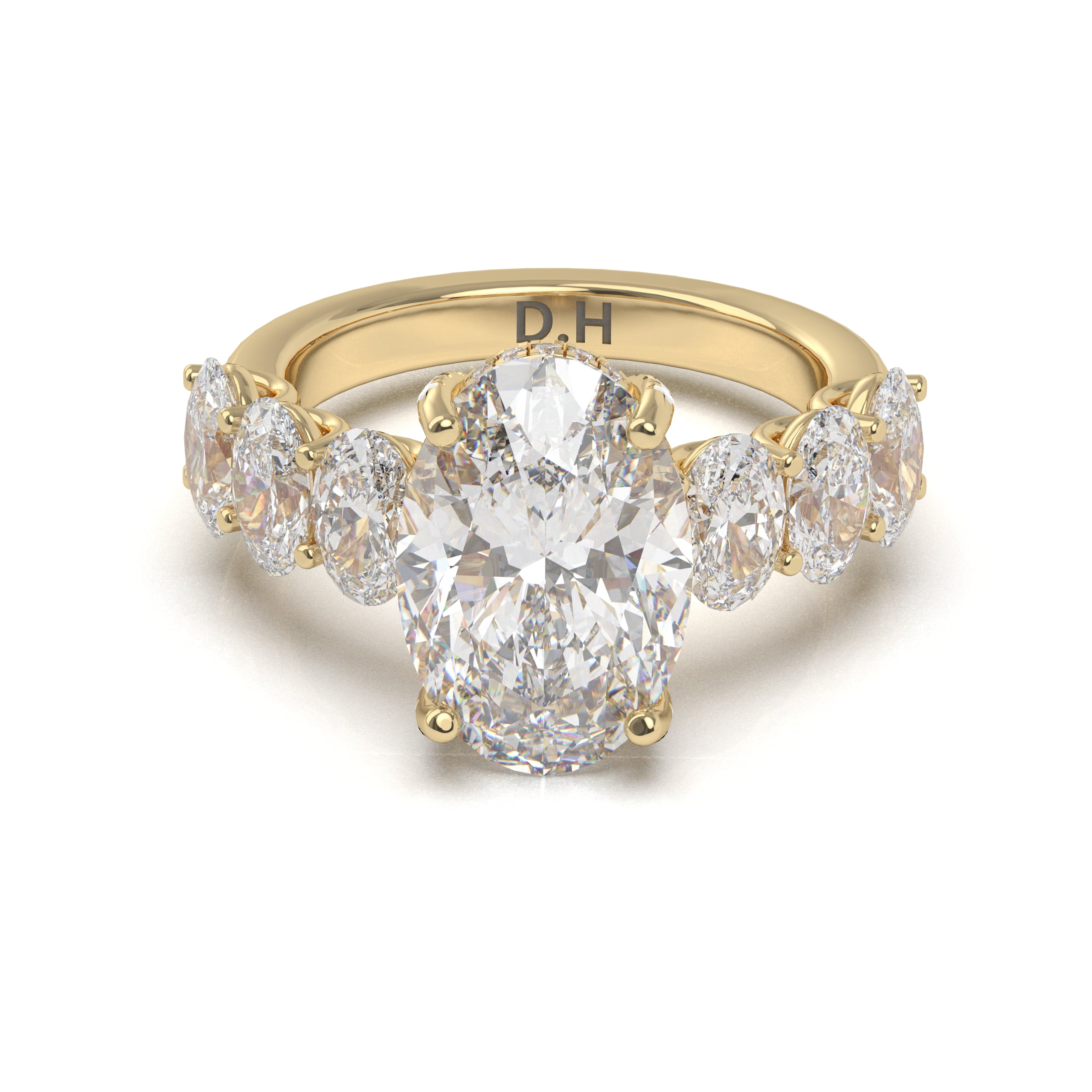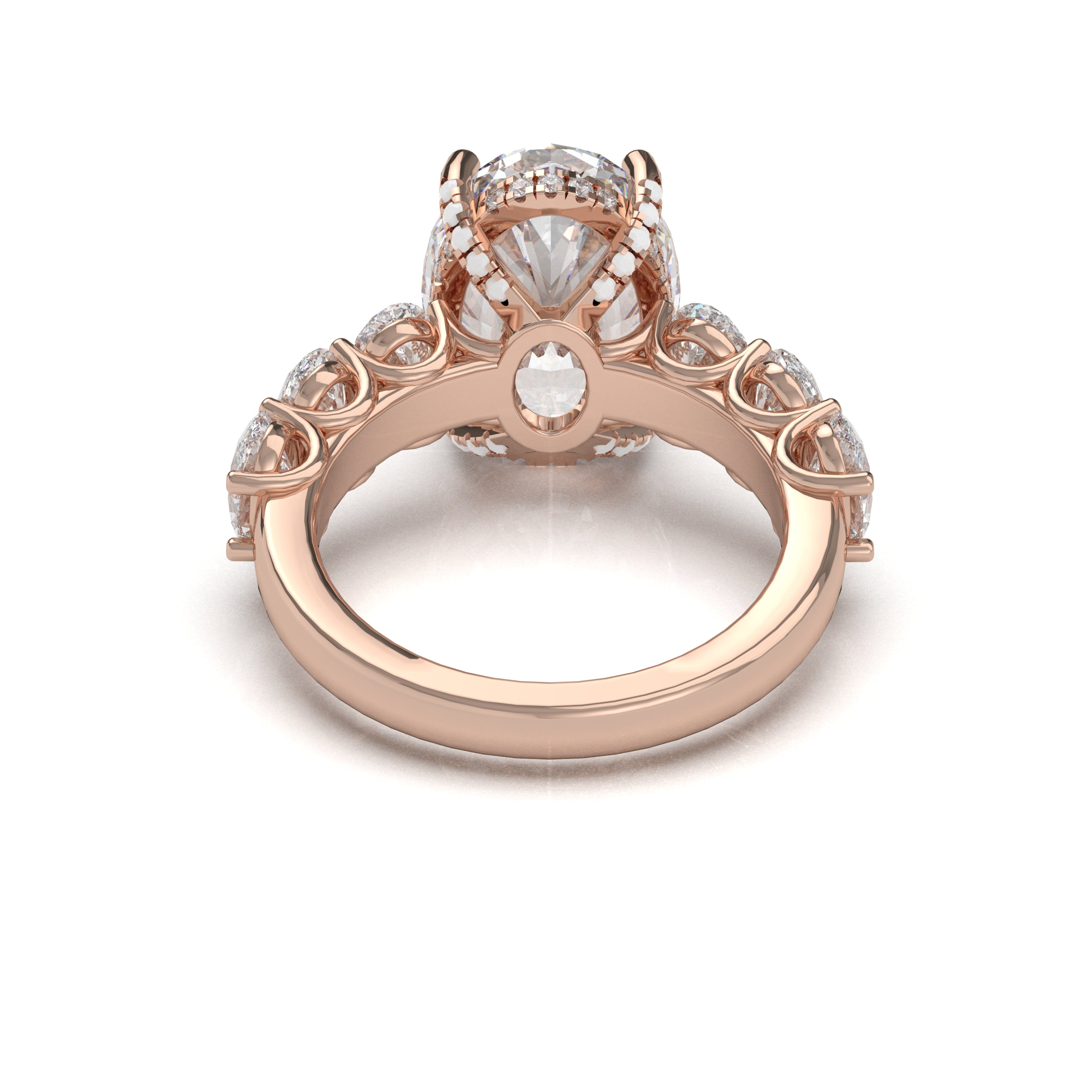 Whoa! The diamond’s girdle is encircled by a tiny “hidden” pavé halo diamond in bubble setting which is an unexpected element that elevates this classic form to the pinnacle of understated beauty. Moreover, it has small oval diamonds on shank in bubble setting. This engagement ring can be special ordered in any finger size, in Platinum, 10KT, 14KT & 18KT gold and can be customized for any shape and size CenterStone.