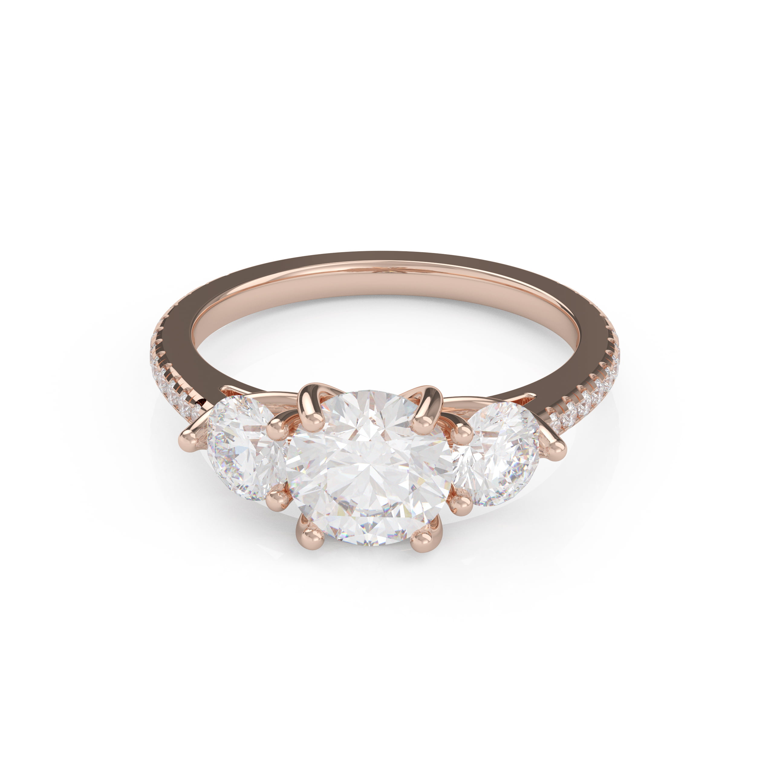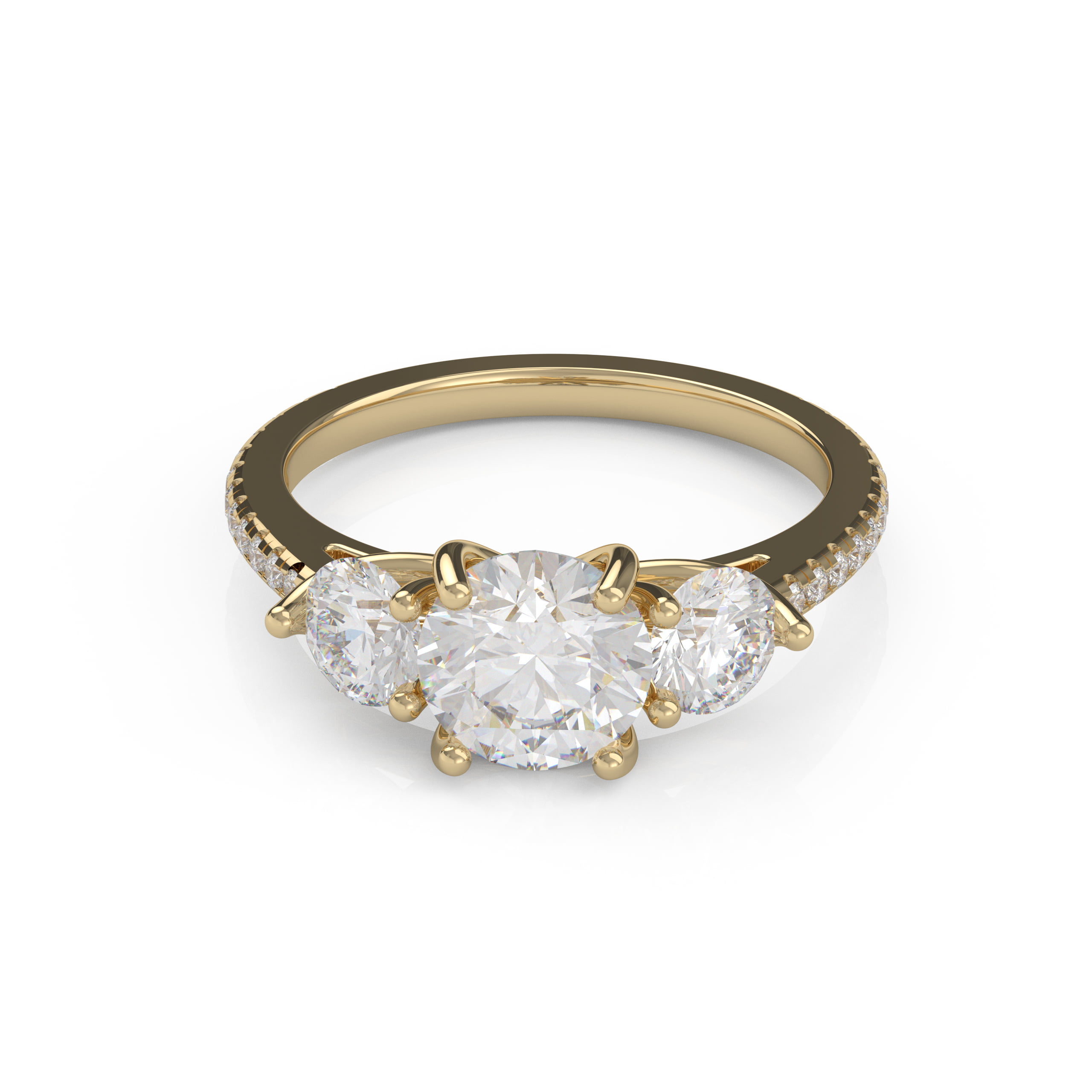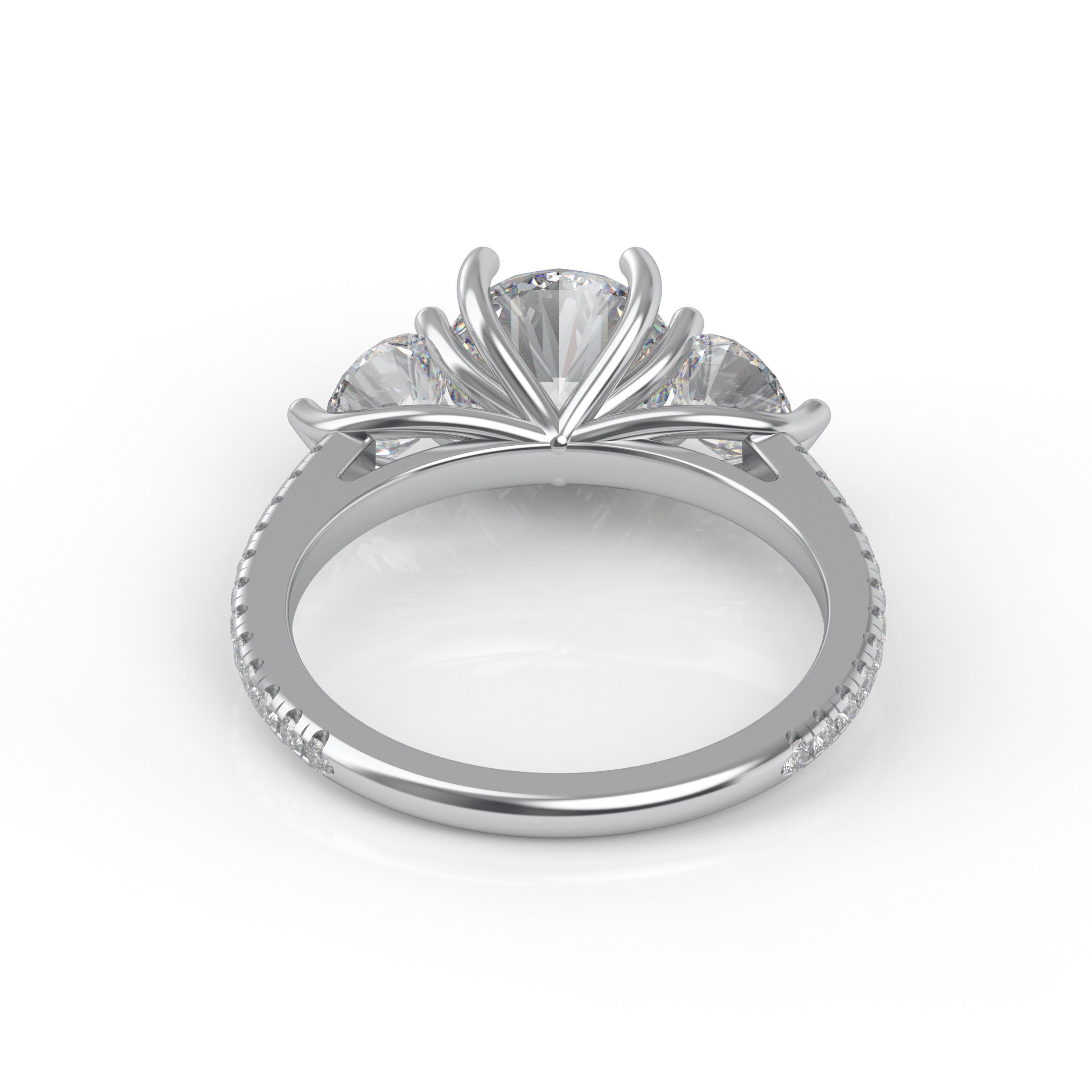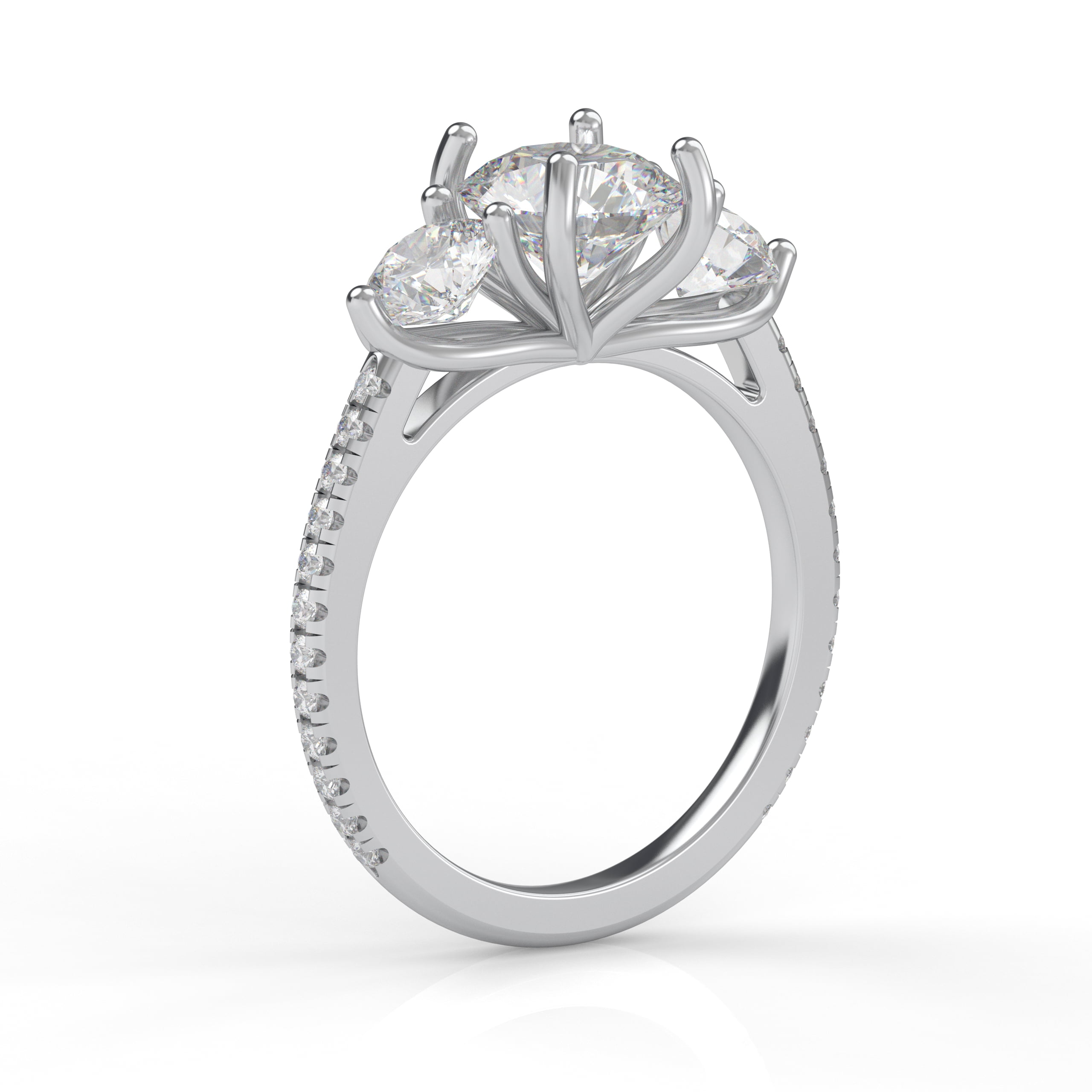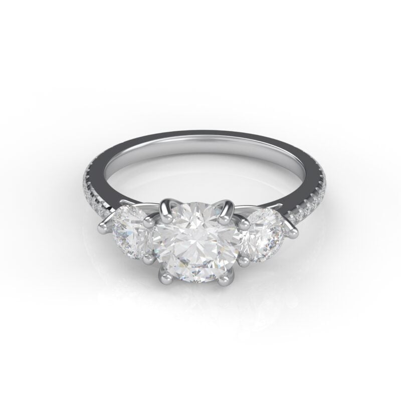 A gorgeous classic that will never be out of style! This lovely three-stone design is enhanced with pavé diamonds on the band, adding a lovely touch to the traditional cross prong pattern!