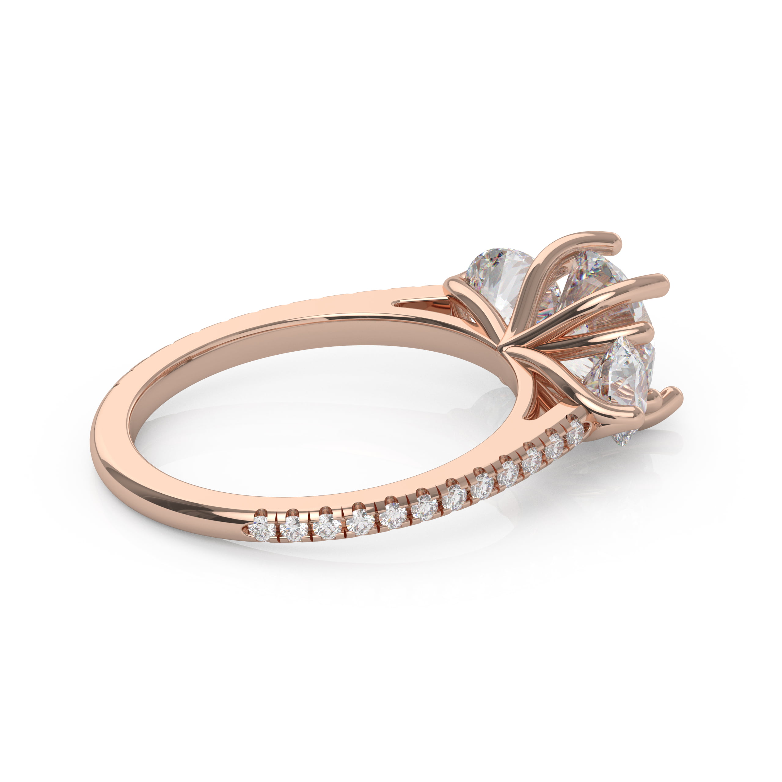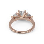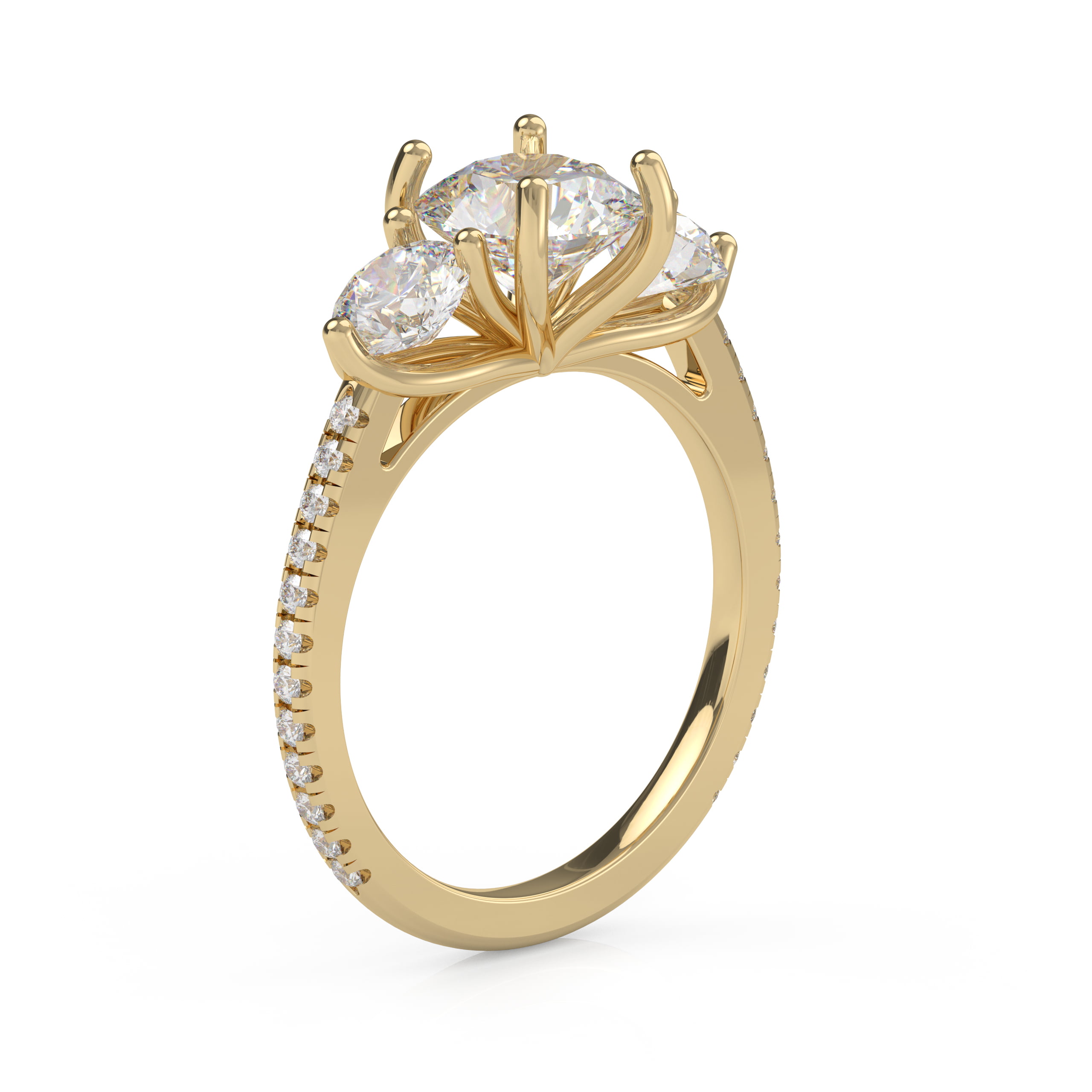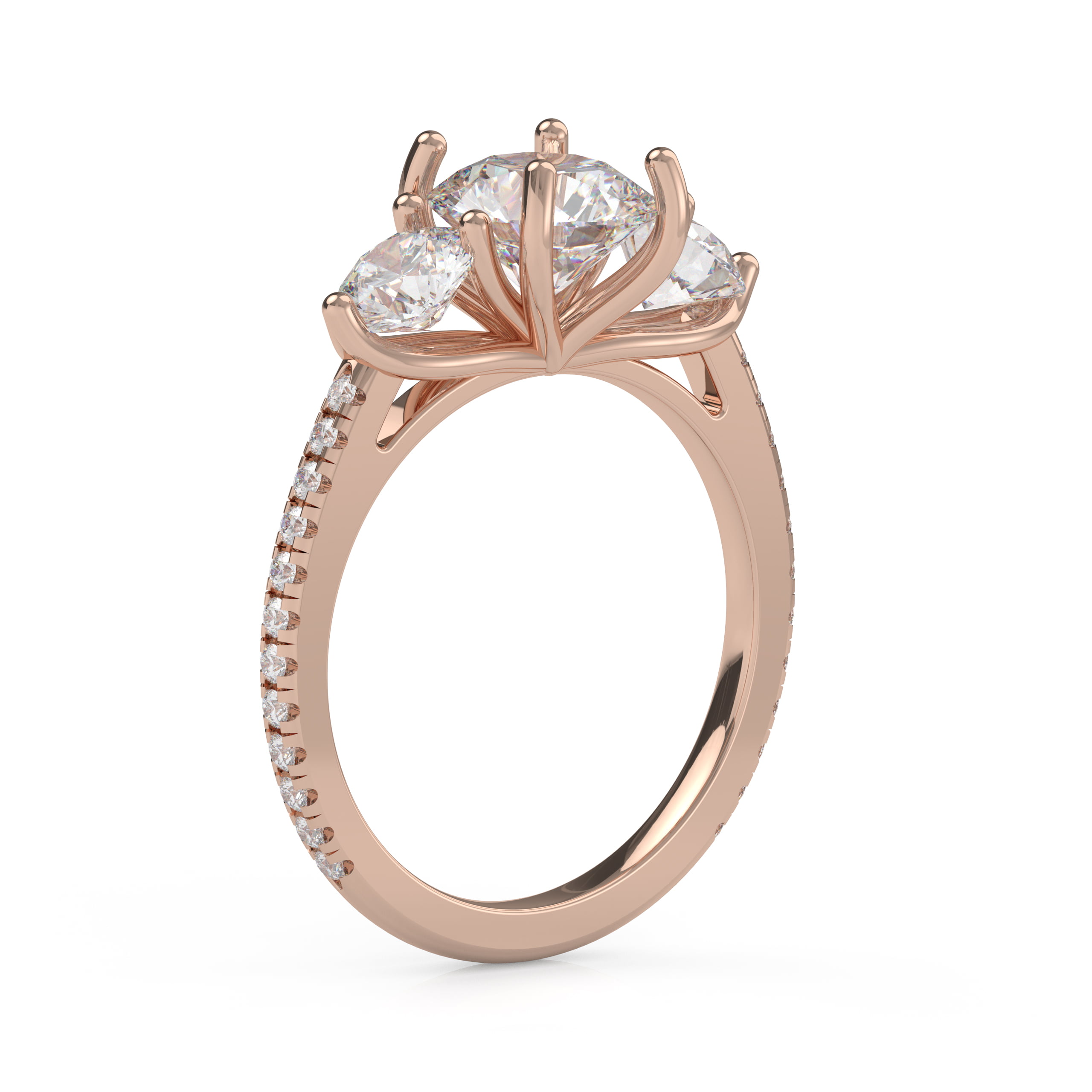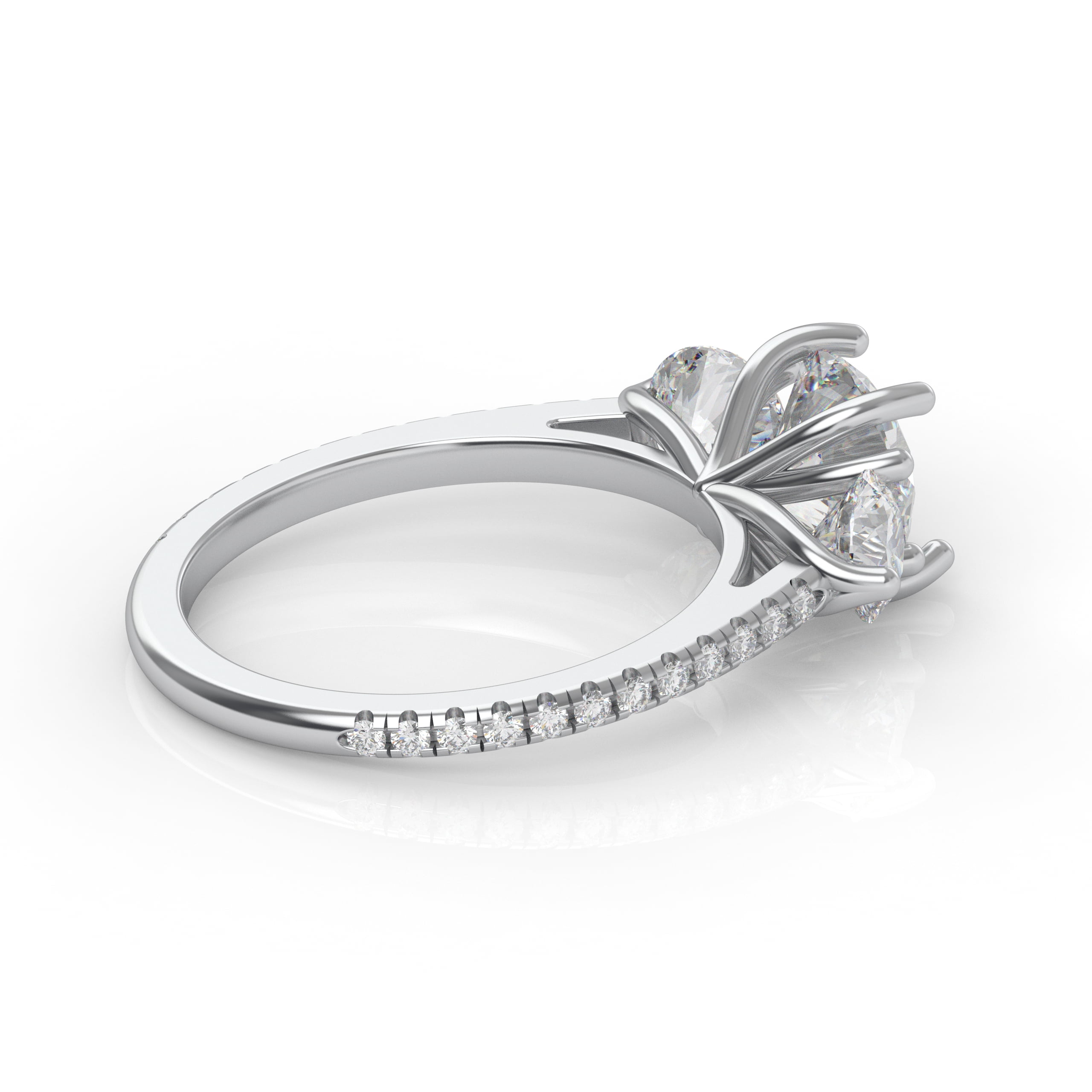 A gorgeous classic that will never be out of style! This lovely three-stone design is enhanced with pavé diamonds on the band, adding a lovely touch to the traditional cross prong pattern!