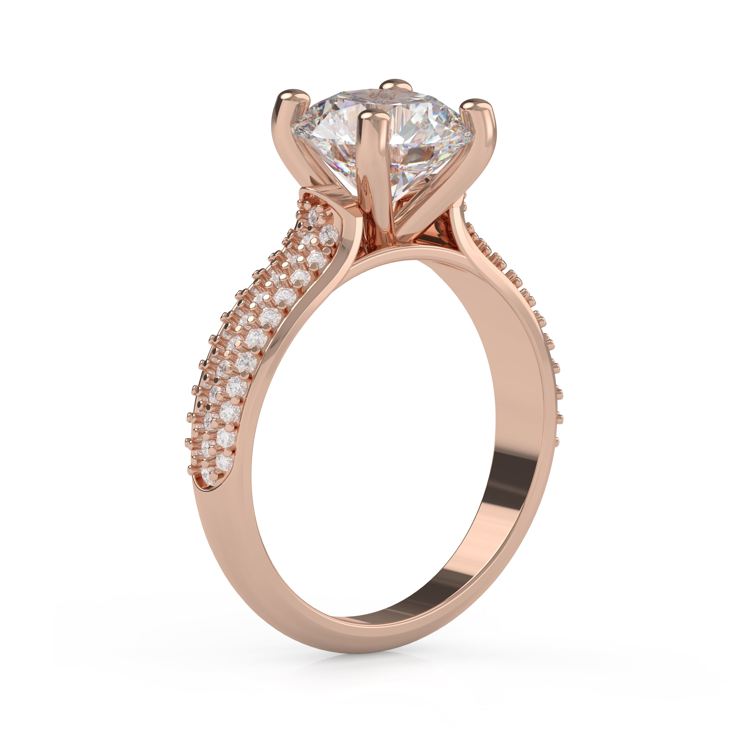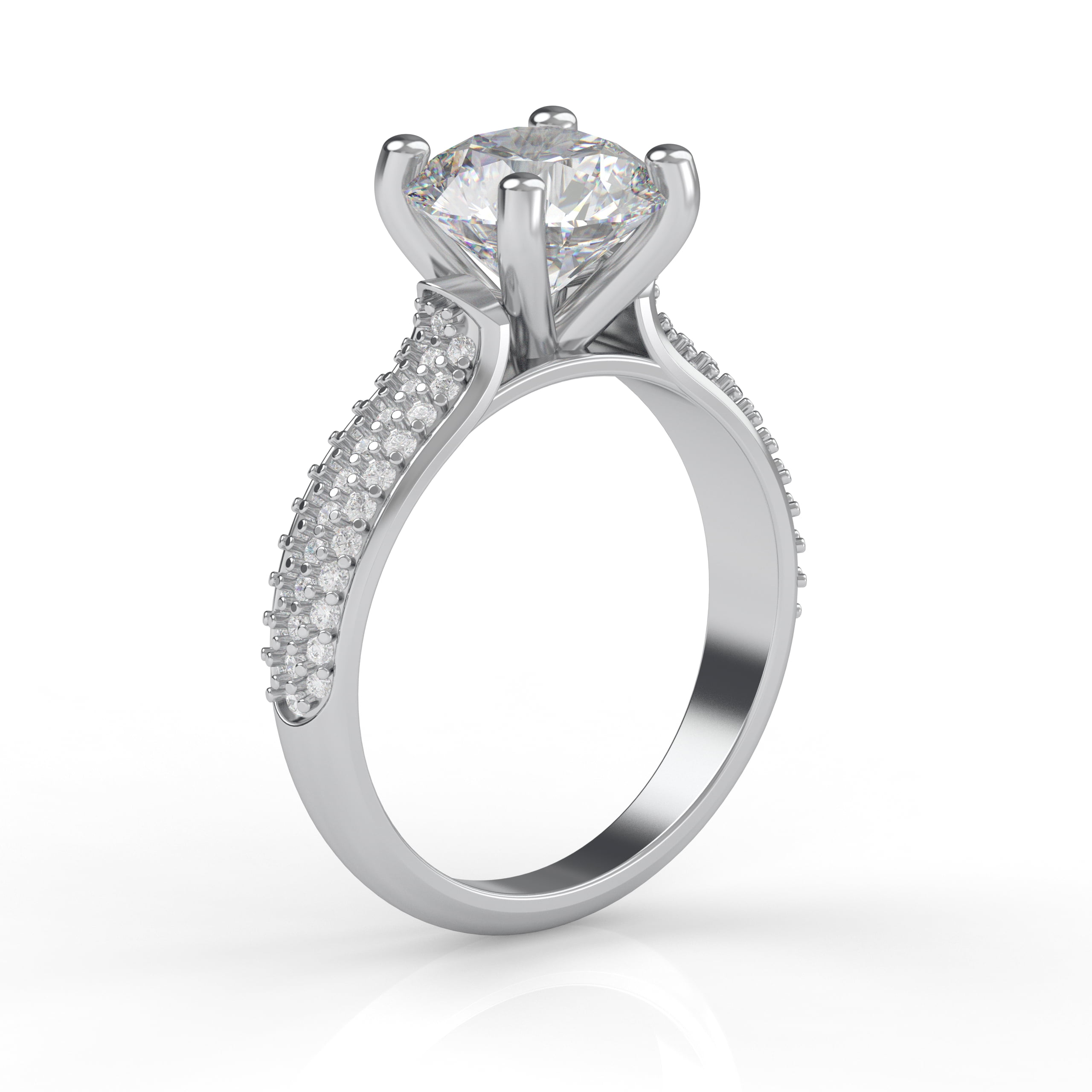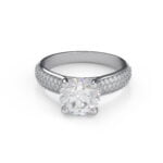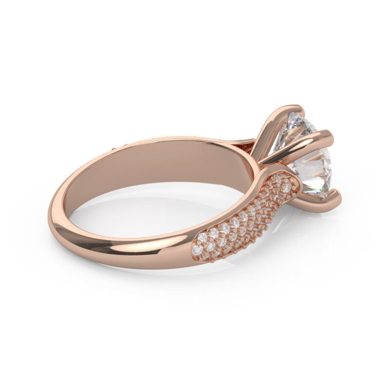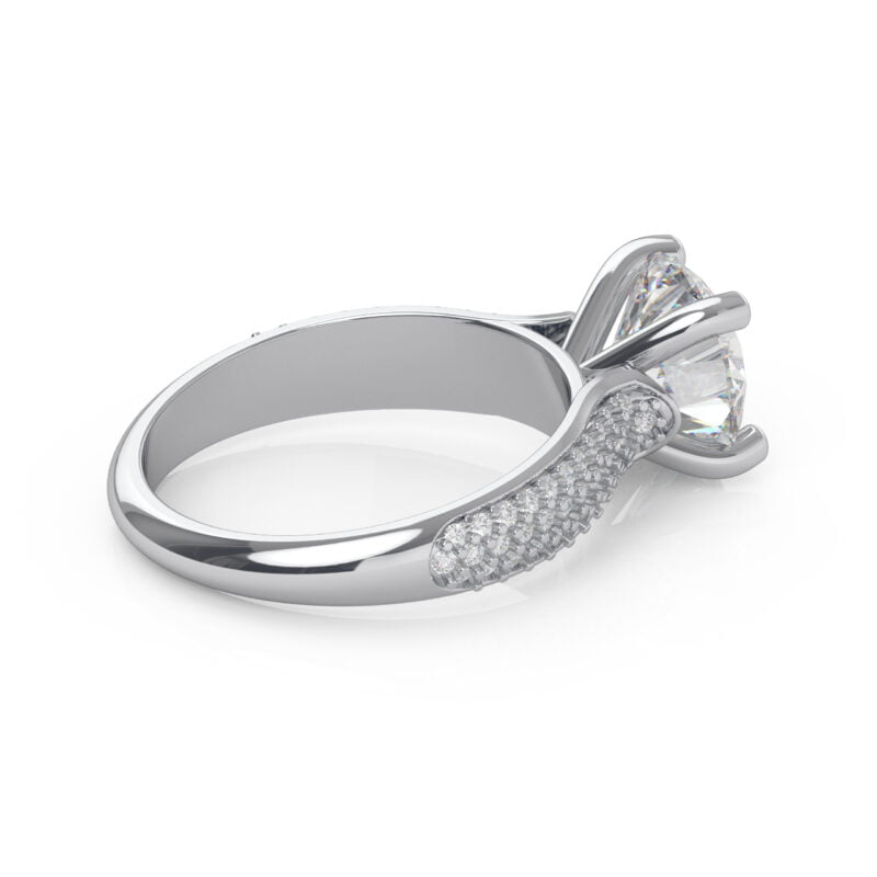 This dazzling four prong engagement ring features a triple row of Pavé set diamonds, creating a ruffle of scintillation for the true romantic!